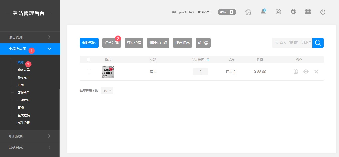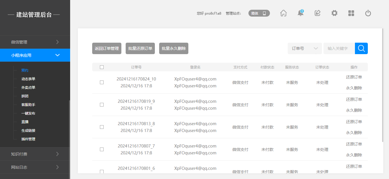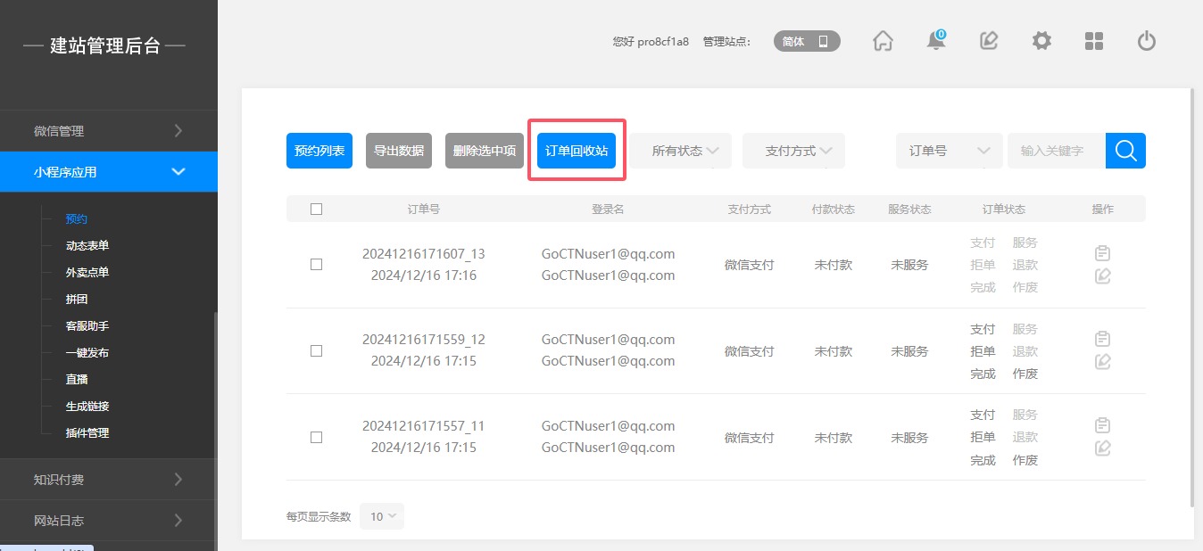 后台:小程序应用 — 预约 — 订单管理 — 订单回收站