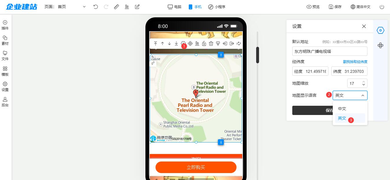 编辑界面:拖入高德地图 — 设置 — 选择地图显示语言