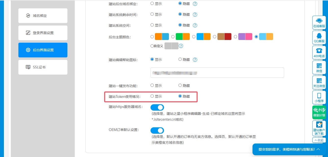 使用场景:在sitestar个人中心上设置建站后台的OEM用量是否显示